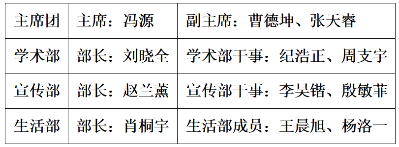 地空系学生会下设四个部门:主席团、宣传部、学术部和生活部。其中,主席团由一名主席和两名副主席组成;其余每个部门均设一名部长及若干干事。