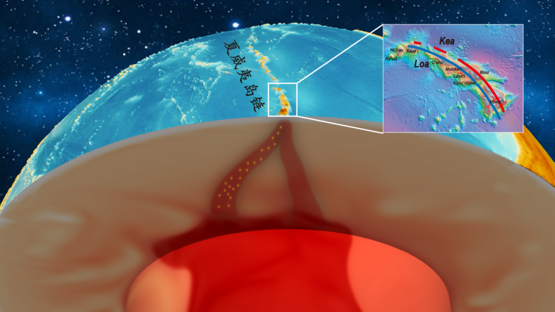 近日,南方科技大学地球与空间科学系副教授胡佳顺课题组在Science Advances发表题为“Bilateral Loa-Kea trends of the Hawaiian Islands caused by the bottom-up splitting of plume conduit”的研究论文。该研究基于包含板块运动数据同化的高分辨率全球地球动力学模拟,不仅成功再现了夏威夷地幔柱的空间位置与演化轨迹,还揭示了地幔柱内部结构演变与地表双侧地球化学分区的深部动力学机制。