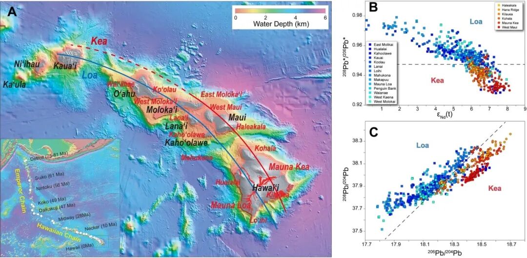 图1.夏威夷区域的水深和地球化学同位素特征分布。(A)夏威夷群岛的水深分布图以及Loa和Kea的分布趋势。(B)εNd(t)与208Pb*/206Pb*的关系。(C)208Pb/204Pb与206Pb/204Pb的相互关系。虚线将夏威夷岛链分为两个不同的类型趋势,即“Loa型”和“Kea型”。