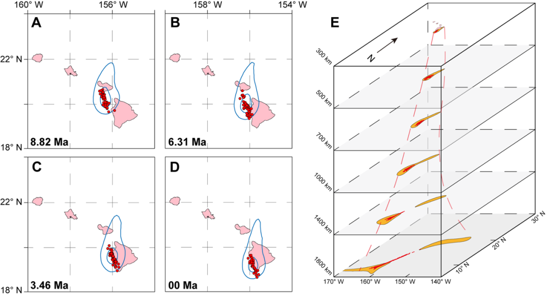 图2.数值模型预测的地幔柱导管内成分场的空间分布随着时间的演化。(A)-(D)300千米深度处夏威夷地幔柱导管中来自太平洋热化学体的物质分布,在过去的8百万年间来自深地幔的物质逐渐向西南部集中。地幔柱导管温度场由蓝色实线勾勒,红点表示来自LLVP的热化学物质。粉红色区域代表夏威夷群岛。(E)夏威夷地幔柱目前的三维温度结构,橙色区域代表夏威夷地幔柱导管,红色区域代表来自LLVP的热化学物质。