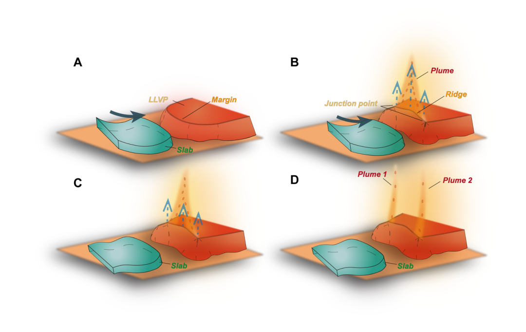 图4.地幔柱演化卡通示意图。(A)俯冲板块到达最下部地幔并接近热化学堆积体。(B)俯冲板块开始推动热化学堆积体,形成两个连接点和一个脊。地幔柱出现在这些连接点,并占据了连接点之间的脊。(C)地幔柱减弱,尤其是在连接点之间的脊上方,而连接点处的上升流仍然相对较强,导致地幔柱导管分裂。(D)地幔柱自下而上分裂,最终在两个连接点形成两个不同的地幔柱。